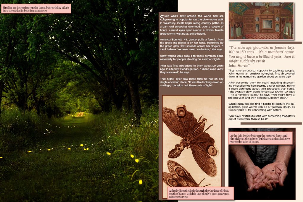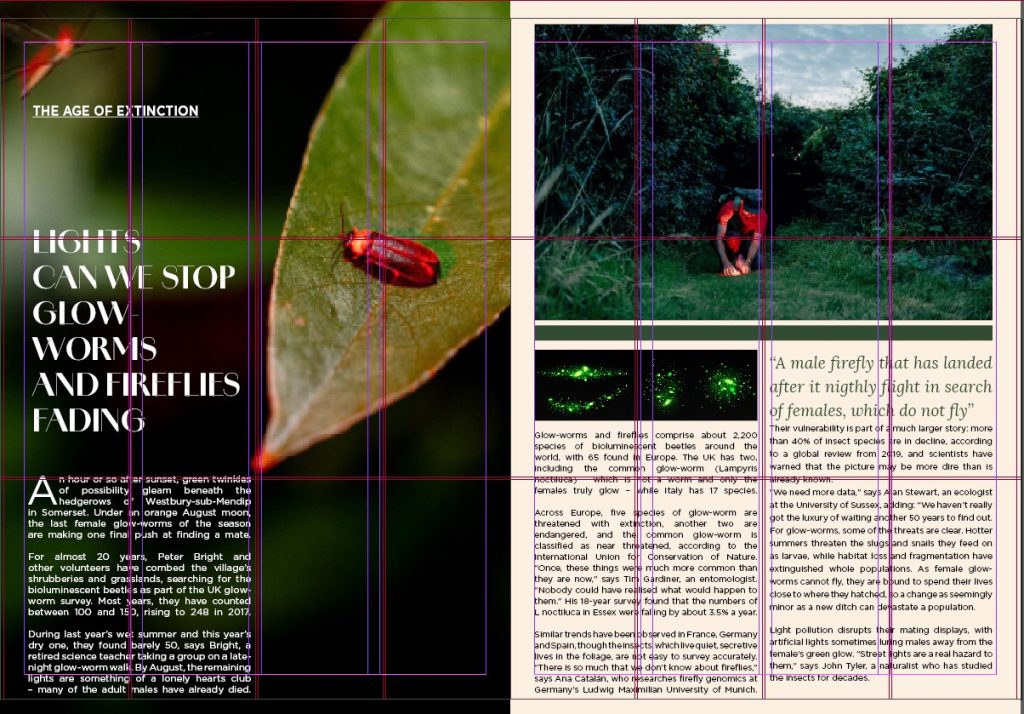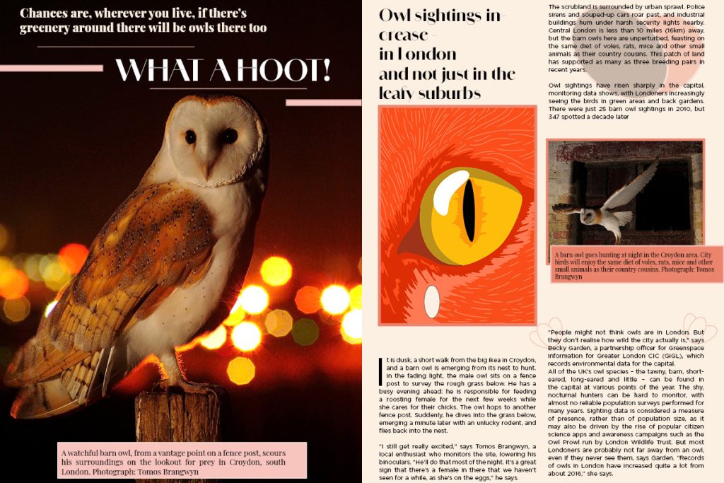 Because the Country Diary piece is observational, I used spacious pacing and a strong opening image to establish mood before introducing text blocks. The owl article contains a more energetic hook, so I used a bolder focal image paired with structured information blocks to keep the spread readable. The glow-worm/firefly article carries urgency, so I strengthened hierarchy and contrast to pull attention to key statements while keeping the overall system consistent with the brand.